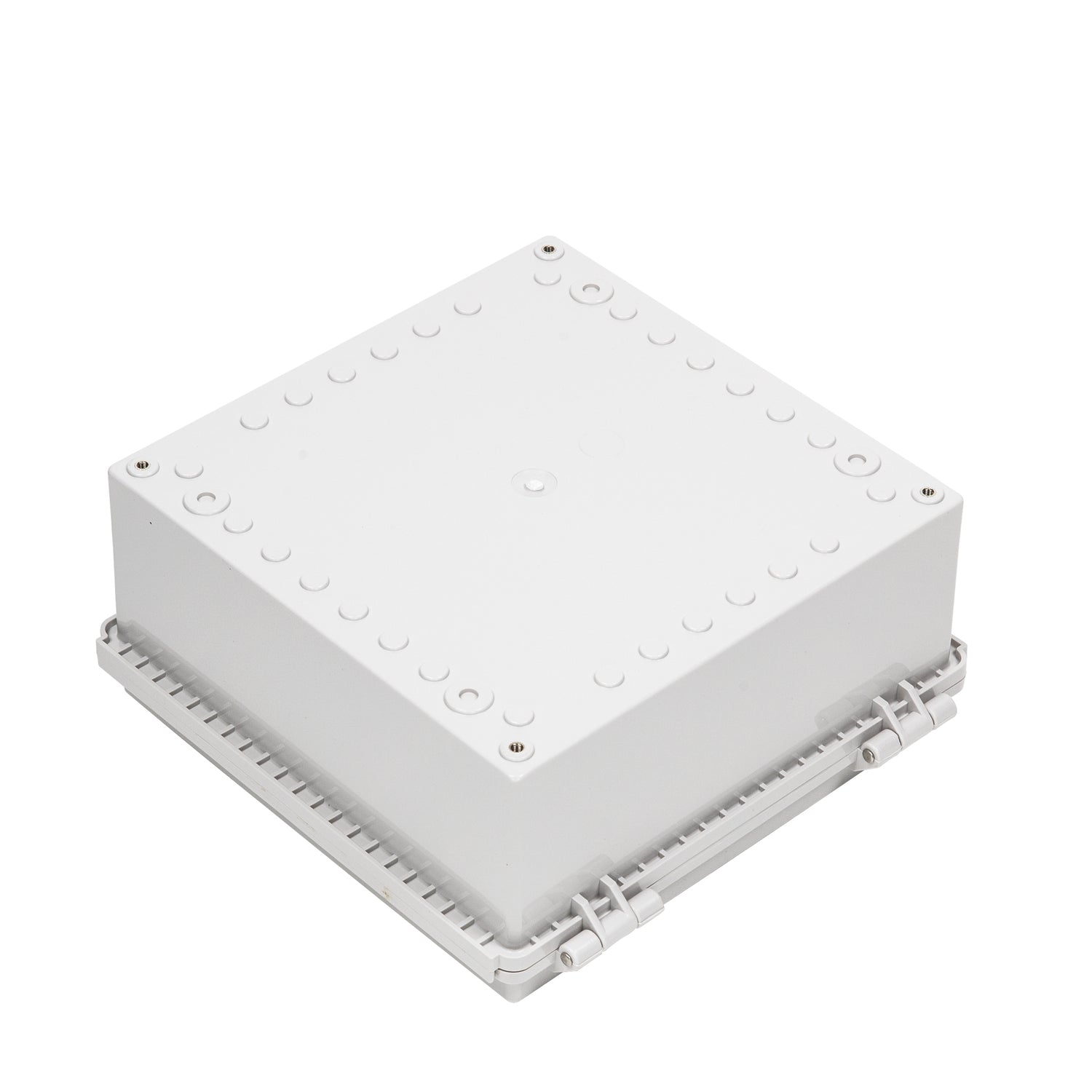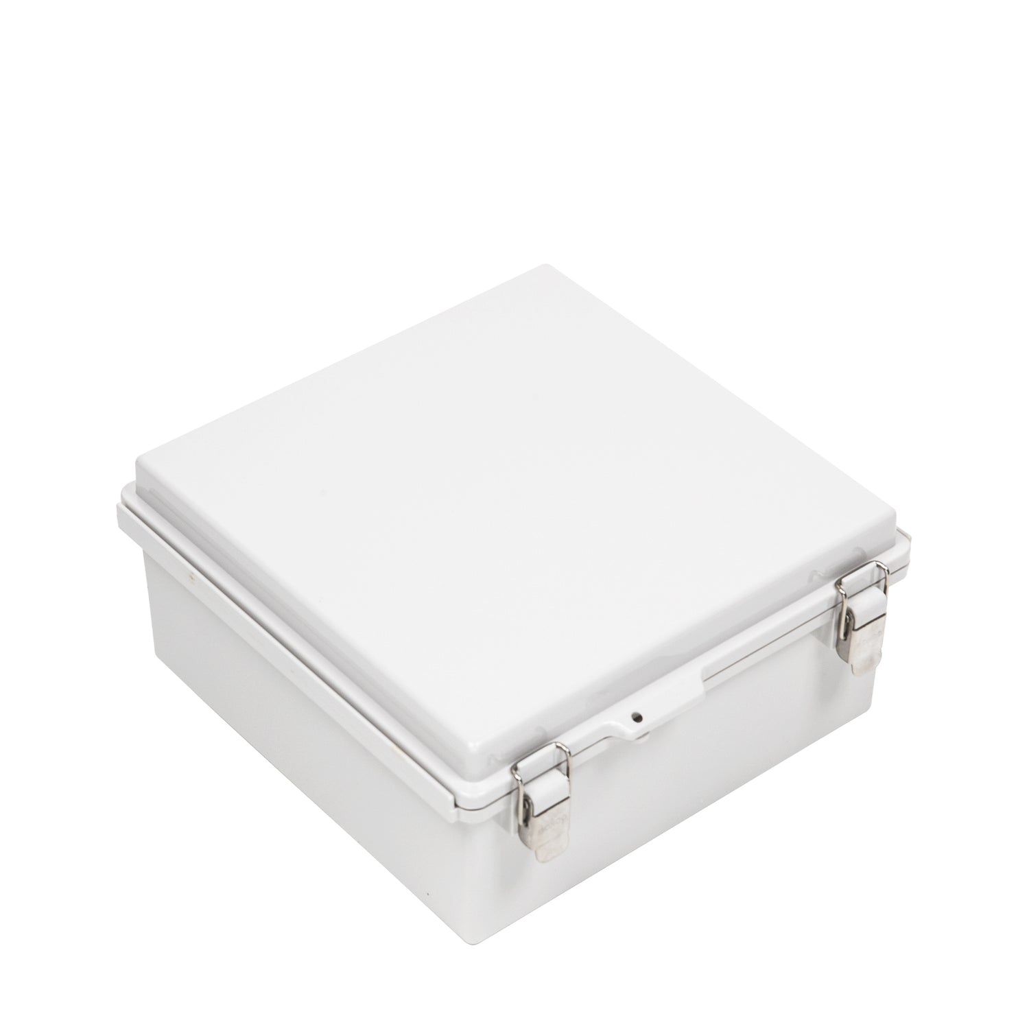 This model adds a molded hinge and latch design, which makes repeat access more practical than a basic screw-cover enclosure. It also combines IP67 sealing, IK08 impact resistance, and polycarbonate construction for stronger protection in industrial or outdoor applications.