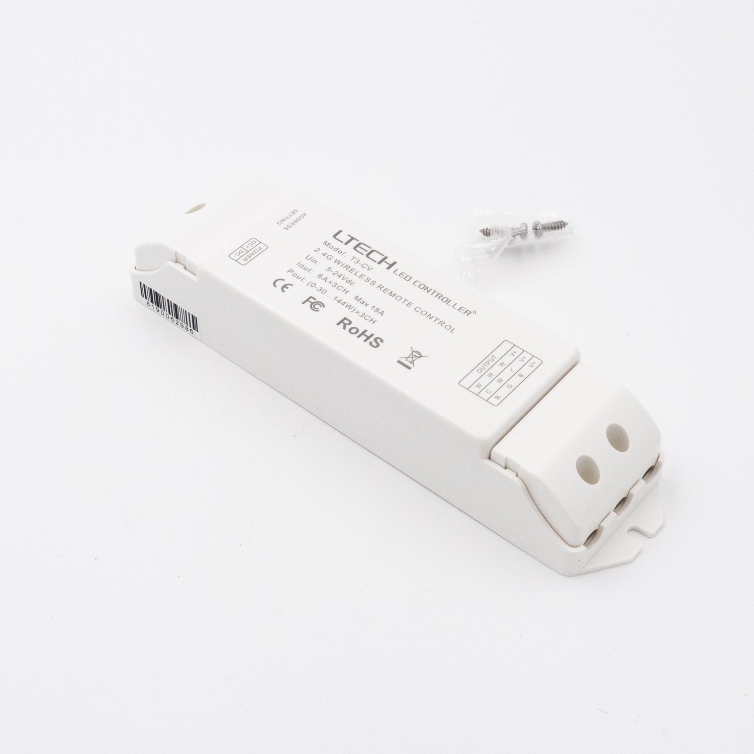 The receiver requires a low voltage input. It receives an RF control signal from a T1/2/3 controller in order to supply the correct dimming output across 3 channels. The input and output is via screw terminals on the sides of the unit.