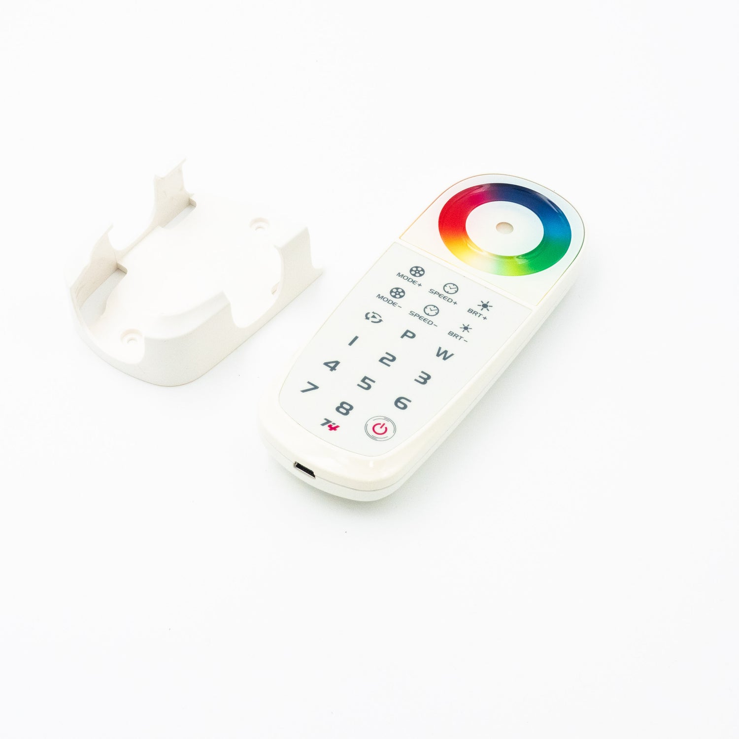 The remote control uses 2.4GHZ RF signal and has a range of 30m. The remote is fitted with an LED indicator which shows light colour currently selected. Features include an on/off button, colour wheel, 8 zone buttons, brightness/speed selection and buttons for selecting effects: jumping, fading, cycling. A built in Lithium battery can be re-charged by plugging a USB cable into the remote - the other end connects to a USB charger or computer.
